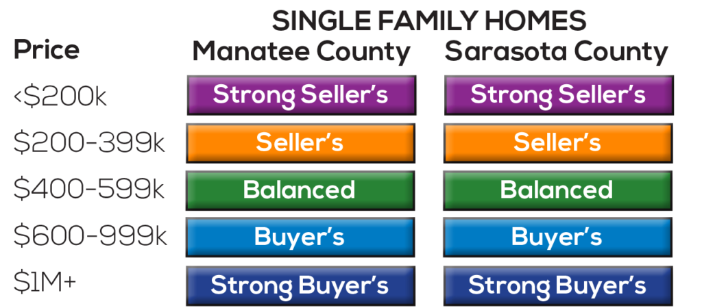 Although Sarasota and Manatee county real estate tends to have a similar pattern, there is some variation. Also, price points matter. The market for $300,000 homes can look very different than the market for home over $1M. Accordingly, I have put together this table for you to get a snapshot of the market for what is most important to you.