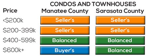 The table below groups all condos & townhomes over $600k into one bucket due to limited transactions above $1M in Manatee. It shows a snapshot for market conditions in both counties.
