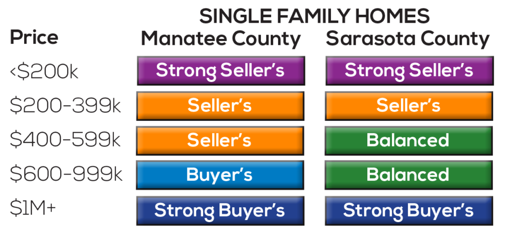 Although Sarasota and Manatee county real estate tends to have a similar pattern, there is some variation on a month to month basis. Also, price points matter. The market for $300,000 homes can look very different than the market for home over $1M. Accordingly, I have put together this table for you to get a snapshot of the market for what is most important to you.