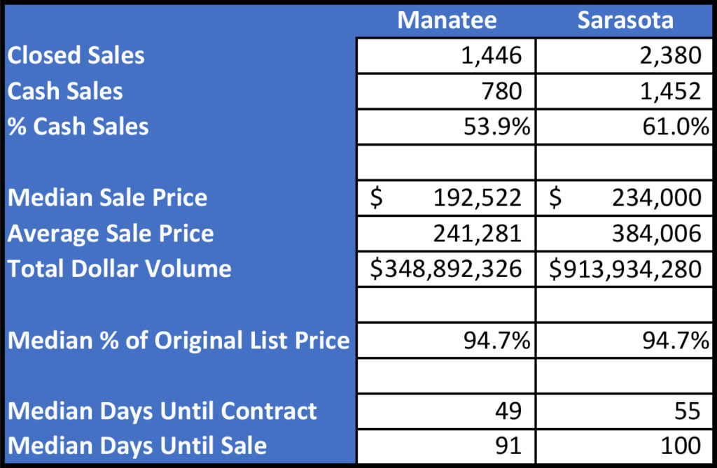Between the two counties, over 3,800 townhomes and condos sold through June of this year. As expected, the Sarasota County market saw almost 2,400 of those sales. Further, more transactions went to cash buyers in Sarasota County (61%) than Manatee County (54%). That said, anytime more than half of the market consists of cash buyers, sellers should be seeing good things (assuming the mortgage market hasn’t seized up, which it hasn’t).
