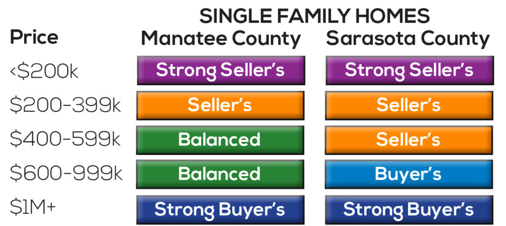 Although Sarasota and Manatee county real estate tends to have a similar pattern, there is some variation on a month to month basis. Also, price points matter. The market for $300,000 homes can look very different than the market for home over $1M. Accordingly, I have put together this table for you to get a snapshot of the market for what is most important to you.