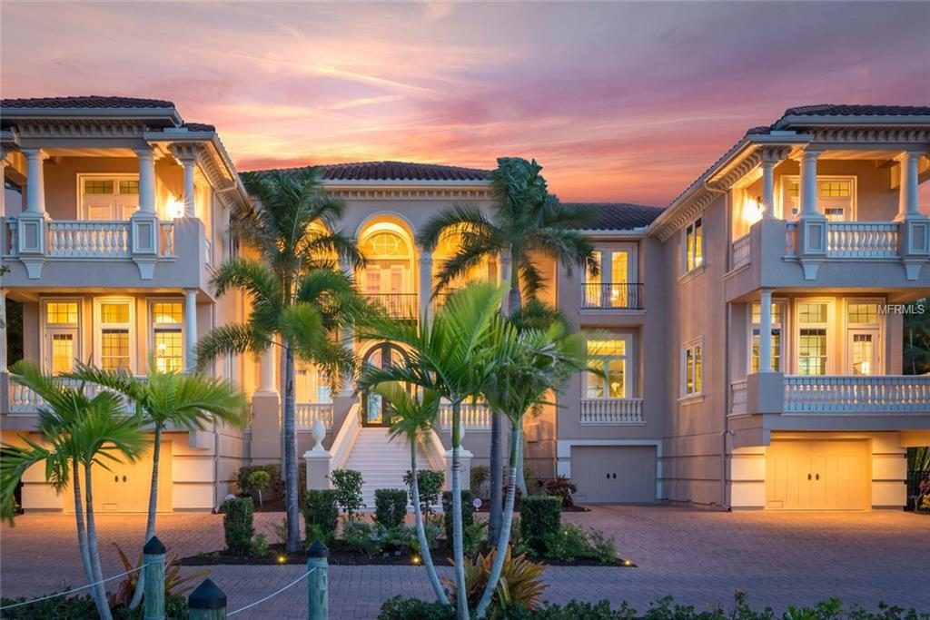 Arrive by boat or by car! Homes with front and back bay views on Siesta are rarely available. Listed at $5,925,000, this five-bedroom, six-bathroom home boasts 7,443 square feet and six garages.