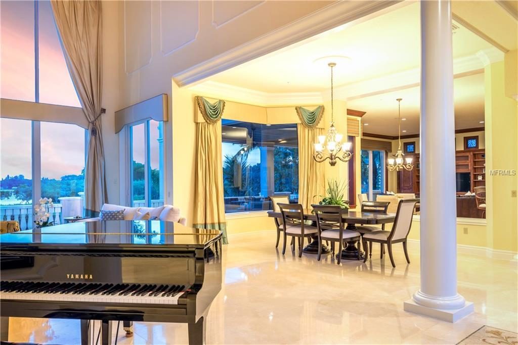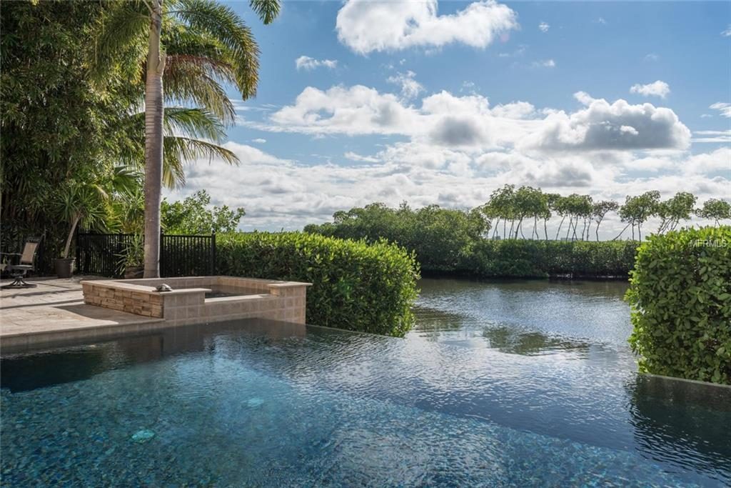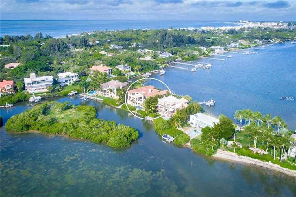 Arrive by boat or by car! Homes with front and back bay views on Siesta are rarely available. Listed at $5,925,000, this five-bedroom, six-bathroom home boasts 7,443 square feet and six garages.