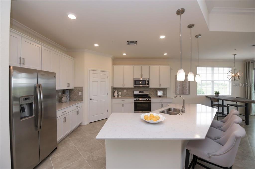 In addition to the three bedrooms, two bathrooms, this condo features a den and a screened-in porch. The kitchen offers GE stainless steel appliances, a natural gas range, a closet pantry, an oversized island with quartz counter and designer pendant lighting.
