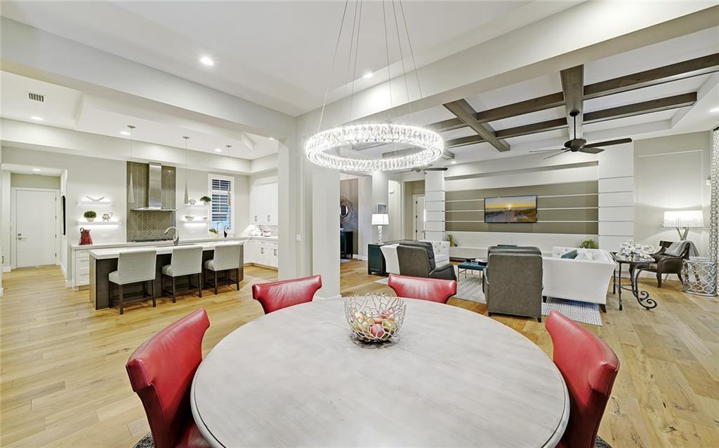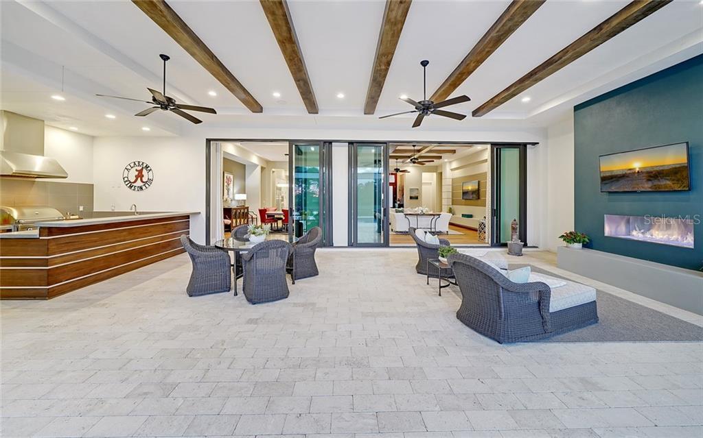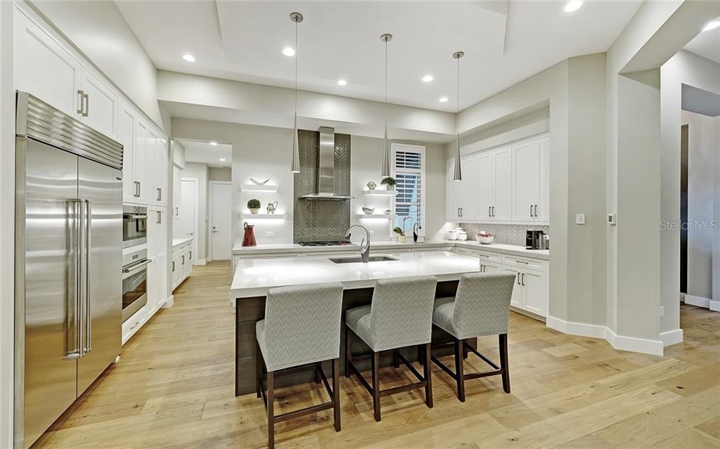 A wall of sliders from great room opens to the lanai with a huge amount of covered area to make the most of Florida living. Enjoy an outdoor kitchen, polished concrete bar, saltwater pool and spa, and a “Pooch Park” lined with AstroTurf. Additional features include blonde oak wood flooring, cypress wood ceilings, drop zone with closet and cabinet storage, designer lighting, landscape lighting, plantation shutters and more.