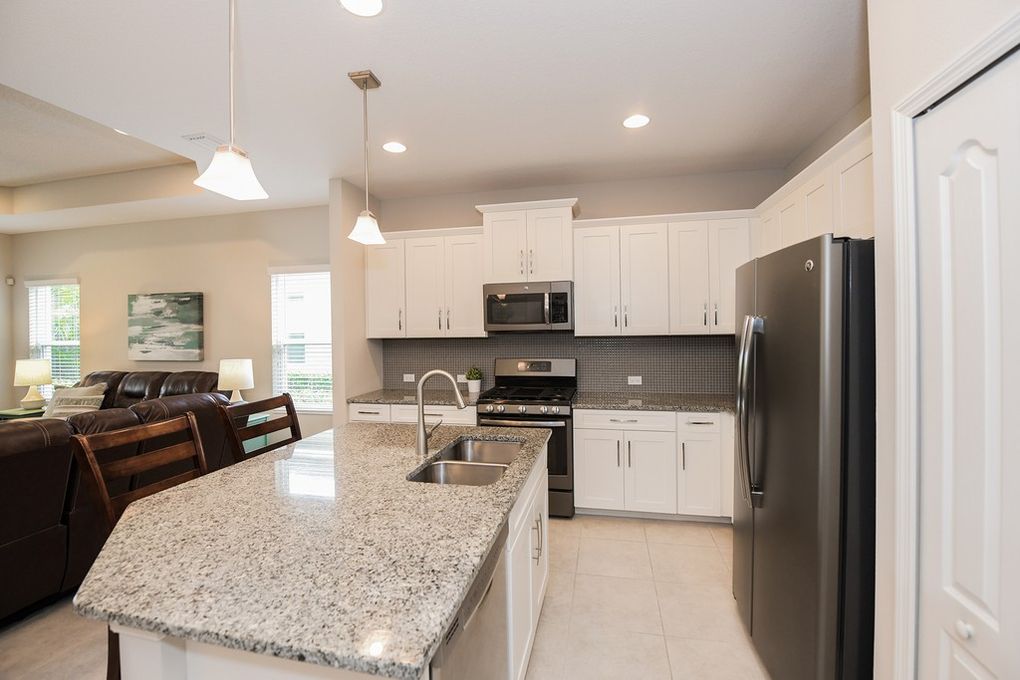 The kitchen has stone countertops, 42″ white cabinets, gray tiled backsplash, upgraded slate gray, smudge-free stainless appliance package with gas range, oversized island and a closet pantry. The spacious owner’s suite has two closets and en-suite bath with walk-in shower, two separate vanities with sink and toilet closet.