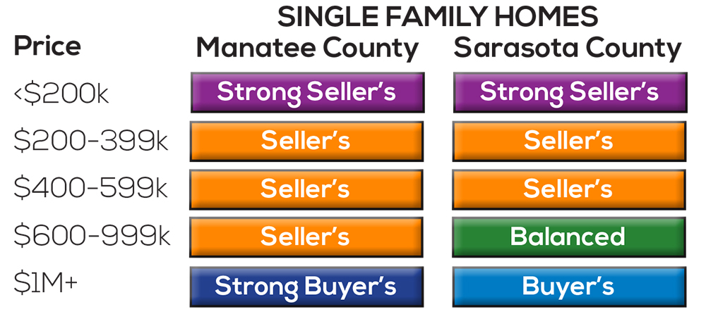 Although Sarasota and Manatee county real estate tends to have a similar pattern, there is usually some variation on a month to month basis. Also, price points matter. The market for $300,000 homes can look vastly different than the market for home over $1M. Accordingly, I have put together this table for you to get a snapshot of the market for what is most important.