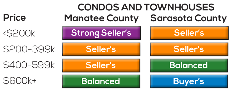 The local market for condos and townhomes is continuing its shift in the Pandemic. When compared to last year at this time, the market favors sellers across all price points in Sarasota County. While Manatee County has the same story as Sarasota County across most price points, the $1M+ price range has improved materially for buyers when compared to last year at this time.