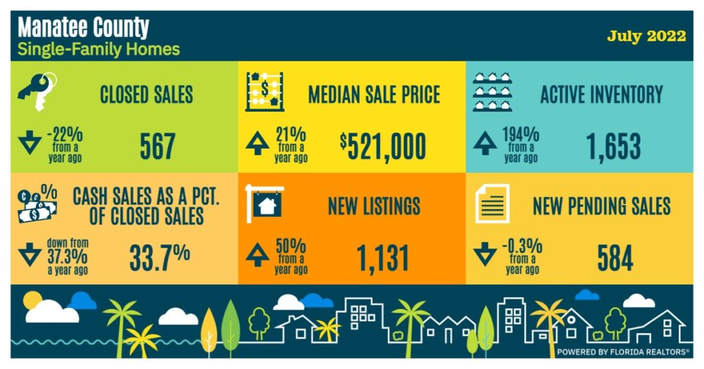 The number of single-family homes sold in Manatee were down 22% YoY in July. While the pace is definitely slowing, prices are holding better than one would expect in this scenario (so far). Inventory is coming on the market quickly, and the active inventory is at around three months of sales volume. Both of these are good signs for balancing the market as sellers have dominated for some time now. How this will ultimately impact price is another story. The law of supply and demand will definitely govern, but the backdrop of the broader economy will definitely play a role.