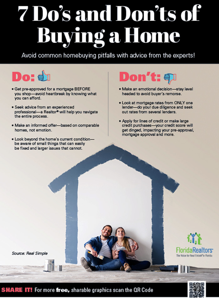Florida Realtors has put together the infographic below for items to do (and not to do) when buying your next home. By ensuring you mind the items listed, you will be on your way to your next home.