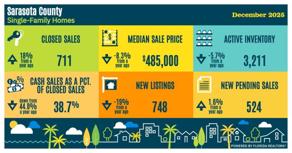 The December 2025 single-family home market in Sarasota County shows mixed signals: closed sales rose 18% year-over-year to 711, while the median sale price fell 8.3% to $485,000, indicating more activity at the lower end of the market. Active inventory decreased 5.7% to 3,211, and new listings dropped sharply 19% to 748, even as new pending sales inched up 1.6% to 524. Cash sales declined to 38.7% of closed transactions from 44.0% a year earlier.
