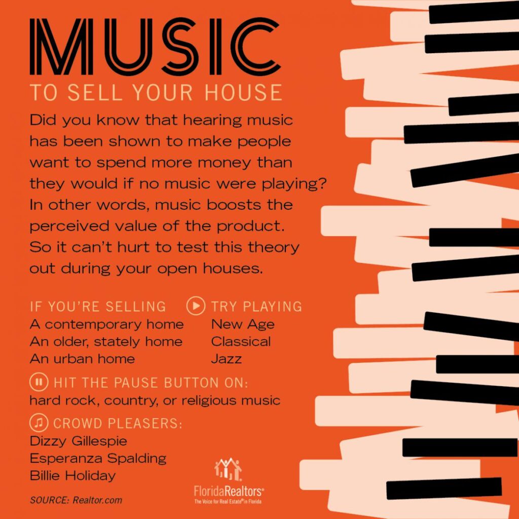 Details will make a difference in getting your home sold. The infographic below from Florida Realtors has one detail that many overlook. Music can influence the mood of potential home buyers, so use it to your advantage. Just one additional positive note can sway a potential buyer into actually writing that offer.