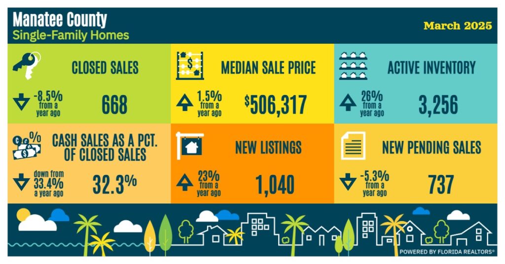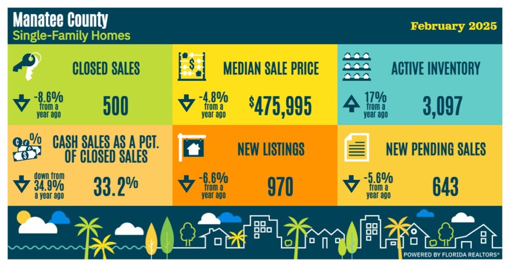 At the same time, active inventory rose sharply by 27% year-over-year to 3,196 homes, reflecting a growing supply in the market. Overall, the combination of declining prices, increased inventory, and reduced cash purchases points to a market adjusting after a period of high activity and price growth. The infographic below from Florida Realtors contains more information.