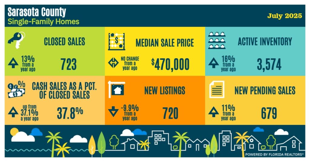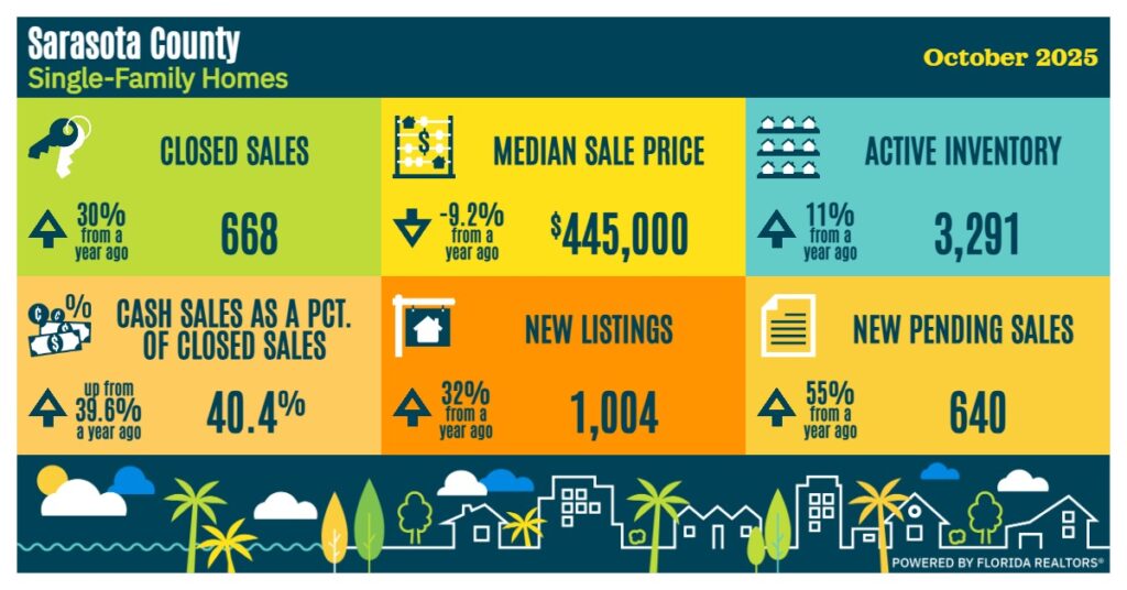 Pricing dynamics diverged from activity: the median sale price slipped 7.5% year over year to $490,000, a notable softening that contrasts with the uptick in pending transactions. Taken together, the data paint a market with constrained supply and fewer new listings, some renewed buyer momentum as shown by pending sales, but downward pressure on prices, conditions that could give buyers more negotiating room even as demand shows signs of recovery. The infographic below from Florida Realtors contains more.