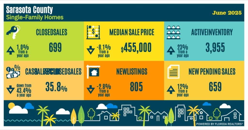 In June 2025, Sarasota County’s single-family home market showed a mix of modest growth and slight cooling trends. Closed sales rose by 1.0% year-over-year to 699 homes, and new pending sales saw a notable increase of 12%, reaching 659. However, the median sale price declined by 8.1%, bringing it down to $455,000. This drop in prices may indicate a shift in buyer affordability or negotiating power.