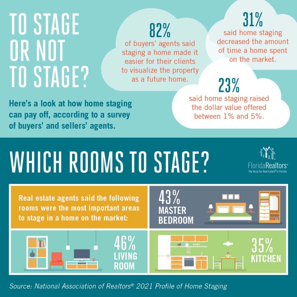 From my experience, staging your home for sale can make a dramatic difference in the selling process. If nothing else, properly staging for pictures will attract more traffic even if you have to move items out prior to contracting for sale. The infographic from Florida Realtors below provides more insight.