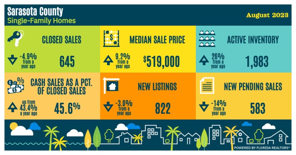 Single-family home transactions slowed down more YoY in Sarasota County than Manatee in August. It isn’t very often that you see closed sales down, inventory up, and the median sales price rise materially. What I believe it is telling us is that the higher end of the market is relatively stronger now than it was last year when compared to the lower half of price points. The percentage of cash sales rising tends to reinforce that belief. The infographic below from Florida Realtors shows more detail from Sarasota County in August.